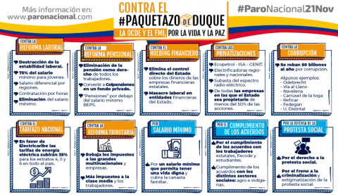 Es en esa perspectiva es que debemos entender el alcance y profundidad de la movilización democrática y progresistas que cuestiona un sistema, que exige democracia, que demanda transparencia. El desempleo, la precarización de la oferta laboral, los falsos positivos, la quiebra del agro, la desindustrialización, las privatizaciones, la reducción del Estado, y la corrupción, hacen justas y valederas las exigencias de trabajo decente, por una vida digna, educación gratuita y de calidad, paz, transparencia y democracia. Hoy nos reafirmamos en que el 21N debe marcar un hito en la movilización social en Colombia. Poco importa que en su desespero estigmaticen el paro y la movilización, que nos persigan, criminalicen la protesta, procedan a hacer allanamientos ilegales, amedrenten. Ese actuar nos da la razón.