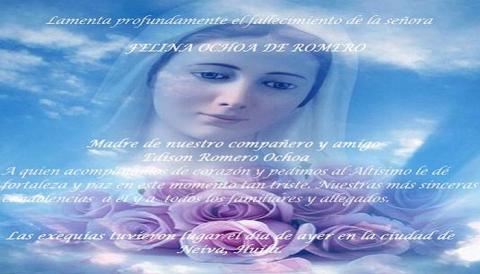 La organización sindical ASCONTROL lamenta el fallecimiento de la Señora FELINA OCHOA DE ROMERO, Madre de nuestro compañero y amigo EDISON ROMERO OCHOA. Paz en su tumba y a Edison y su familia le expresamos nuestro abrazo solidario con los deseos que el Todopoderoso les otorgue fortaleza para momentos tan dificiles.